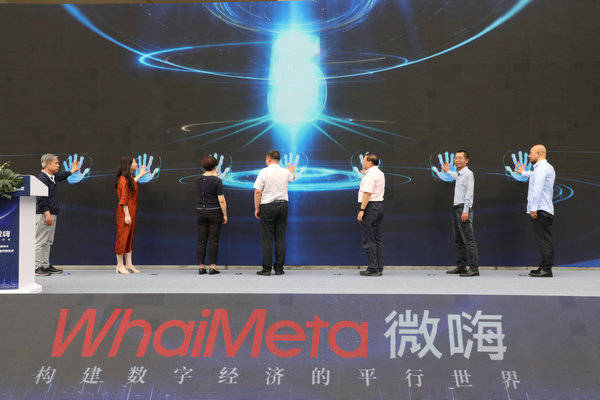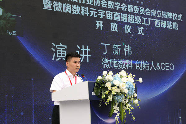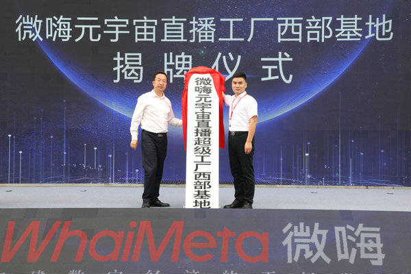 当代世界(北京)信息科技研究院研究员、副院长金惠代表研究院为微嗨数科元宇宙直播工厂西部基地授牌。西安市高新区机关党委专职副书记兼纪委书记吴峰与微嗨数科创始人&CEO丁新伟为“元宇宙直播超级工厂西部基地”揭牌。
