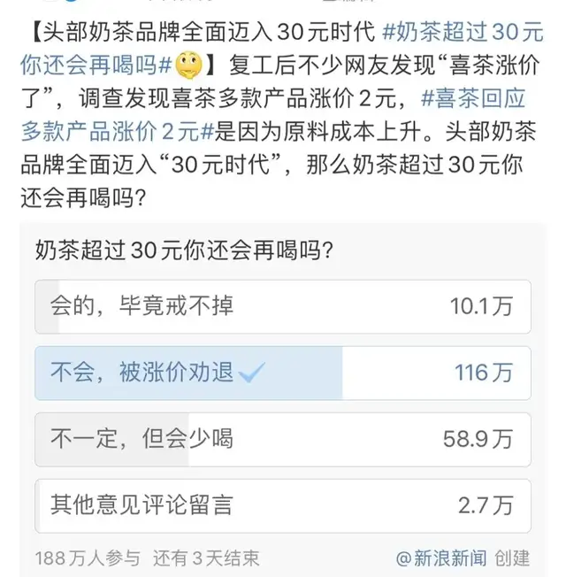 喜茶涨价后,微博热搜上3.7亿人都在关注一个话题:奶茶超过30元,你还会再喝吗?