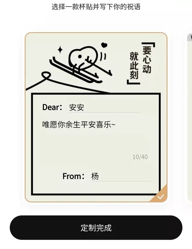 在喜茶的小程序“喜茶GO”上,顾客可以使用“自定义杯贴”功能给自己送祝福。