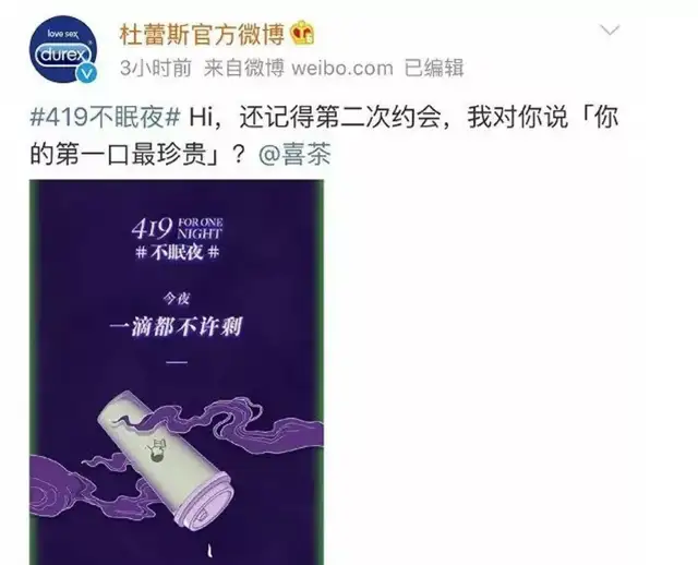最著名的翻车莫过于喜茶在2019年与杜蕾斯的联动。